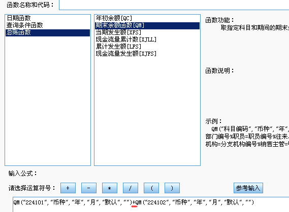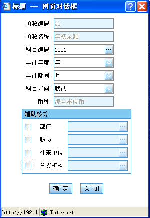 下面以年初余额[QC]录入为例,在双击该函数或者点参考输入后弹出参数录入界面,如下图: