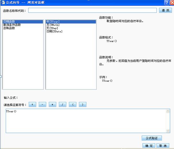选择对应的公式单元格点击右键---输入公式---打开公式输入界面,存在日期函数、查询条件函数和总账函数。先从第一列中选择函数类型.再从第二列选择函数。双击选中的函数,下表框中自动出现函数格式。