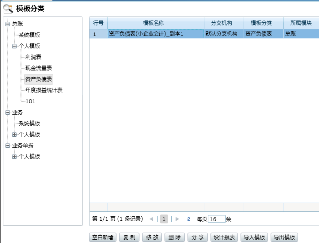 总账管理-财务报表-自定义报表设计-选中左边的系统模板,然后点击下方的复制按钮-点开个人模板-选中复制过来的模板名称-点击下方设计报表按钮-弹出选择分支机构界面,这里的机构需要选择独立核算机构,并且该机构已经分配了会计科目。