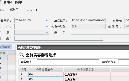 接下来进行套餐申购操作:会员管理--会员美容套餐申购单