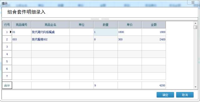 如客户由于不喜欢原来的餐椅,需要换另一种餐椅,并且餐厅比较大,需要配置8个餐椅,则在上表体中双击“数量”字段,调出明细商品录入界面,直接调整即可。