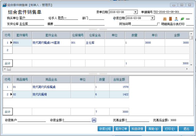 首先,在“组合套件设置”中,设置一个套件的模板和价格。比如一套现代简约风的餐桌,由一张简约风的餐桌+6把餐椅组成。餐桌的零售价是2000,餐椅零售价300,整套出售的价格为3000。设置如下: